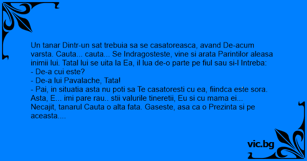 Necajit, tanarul Cauta o alta fata. Gaseste, asa ca o Prezinta si pe aceasta. Tatal il i-a deoparte: