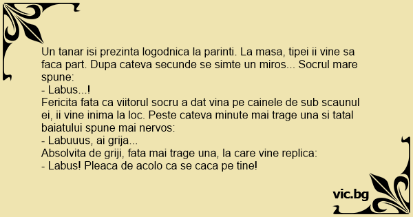 Fericita fata ca viitorul socru a dat vina pe cainele de sub scaunul ei, ii vine inima la loc. Peste cateva minute mai trage una si tatal baiatului spune mai nervos: