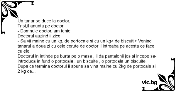 Dupa ce termina doctorul ii spune sa vina maine cu 2kg de portocale si 2 kg de biscuiti.