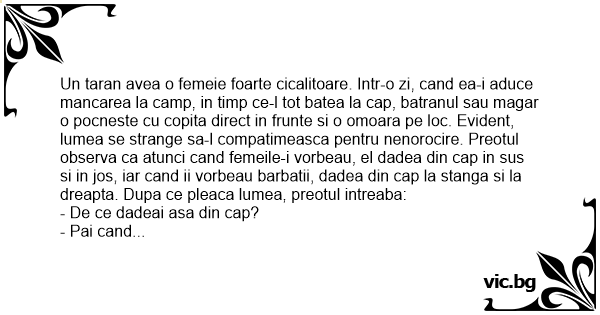 Un taran avea o femeie foarte cicalitoare. Intr-o zi, cand ea-i aduce mancarea la camp, in timp ce-l tot batea la cap, batranul sau magar o pocneste cu copita direct in frunte si o omoara pe loc. Evident, lumea se strange sa-l compatimeasca pentru nenorocire. Preotul observa ca atunci cand femeile-i vorbeau, el dadea din cap in sus si in jos, iar cand ii vorbeau barbatii, dadea din cap la stanga si la dreapta. Dupa ce pleaca lumea, preotul intreaba: