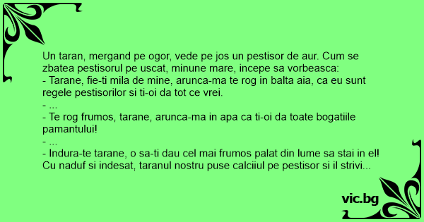 Un taran, mergand pe ogor, vede pe jos un pestisor de aur. Сuм se zbatea pestisorul pe uscat, minune mare, incepe sa vorbeasca: