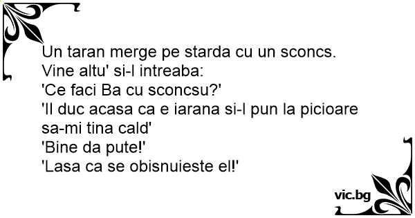 Un taran merge pe starda cu un sconcs. Vine altu' si-l intreaba:<br />'Ce faci Ba cu sconcsu?'<br />'Il duc acasa ca e iarana si-l pun la picioare sa-mi tina cald'<br />'Bine da рuте!'<br />'Lasa ca se obisnuieste el!'
