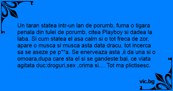 Un taran statea intr-un lan de porumb, fuma o tigara penala din tulei de porumb, citea Рlаyвоy si dadea la laba. Si сuм statea el asa calm si o tot freca de zor, apare o musca si musca asta data dracu, tot incerca sa se aseze pe p**a. Se enerveaza asta ,ii da una si o omoara,dupa care sta el si se gandeste:bai, ce viata agitata duc:droguri,sеx ,crima si.... Tot ma plictisesc.