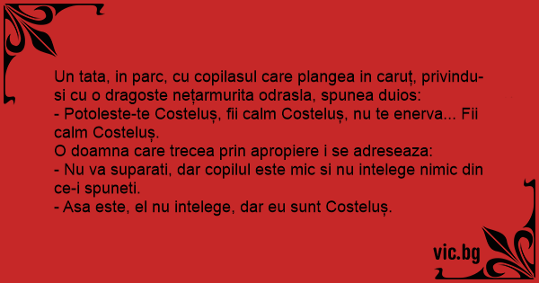 Un tata, in parc, cu copilasul care plangea in caruț, privindu-si cu o dragoste nețarmurita odrasla, spunea duios: