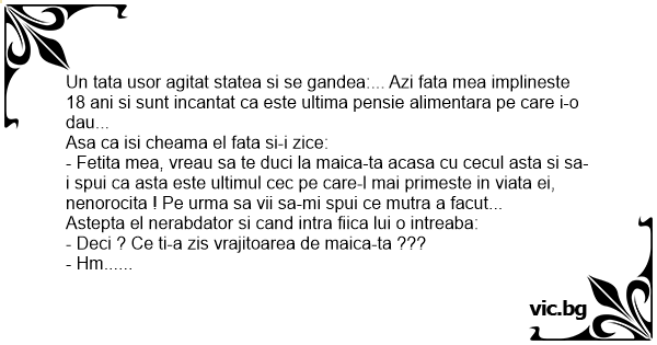 Un tata usor agitat statea si se gandea:... Azi fata mea implineste 18 ani si sunt incantat ca este ultima pensie alimentara pe care i-o dau...