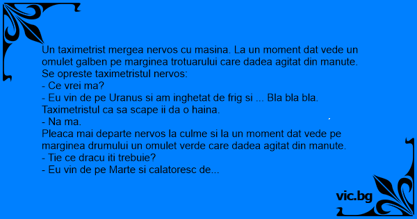 Un taximetrist mergea nervos cu masina. La un moment dat vede un omulet galben pe marginea trotuarului care dadea agitat din manute.