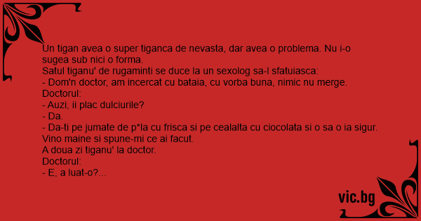 Un tigan avea o super tiganca de nevasta, dar avea o problema. Nu i-o sugea sub nici o forma.