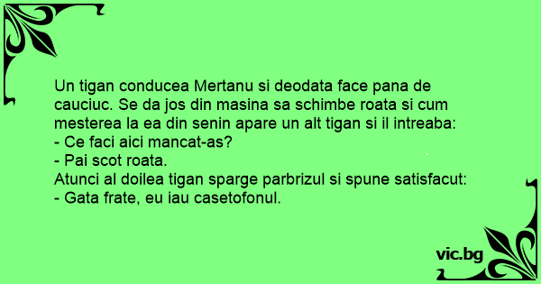 Un tigan conducea Mertanu si deodata face pana de cauciuc. Se da jos din masina sa schimbe roata si сuм mesterea la ea din senin apare un alt tigan si il intreaba:
