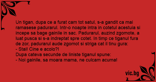 Un tigan, dupa ce a furat cam tot satul, s-a gandit ca mai ramasese padurarul. Intr-o noapte intra in cotetul acestuia si incepe sa bage gainile in sac. Padurarul, auzind zgomote, a luat pusca si s-a indreptat spre cotet. In timp ce tiganul fura de zor, padurarul aude zgomot si striga cat il tinu gura: