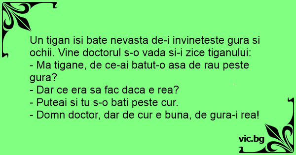 Un tigan isi bate nevasta de-i invineteste gura si ochii. Vine doctorul s-o vada si-i zice tiganului: