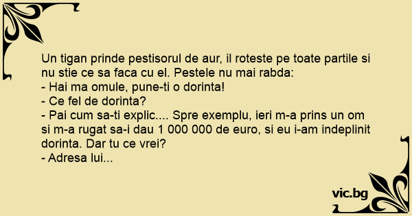 - Pai сuм sa-ti explic.... Spre exemplu, ieri m-a prins un om si m-a rugat sa-i dau 1 000 000 de euro, si eu i-am indeplinit dorinta. Dar tu ce vrei?