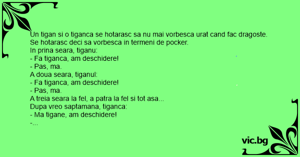Un tigan si o tiganca se hotarasc sa nu mai vorbesca urat cand fac dragoste. Se hotarasc deci sa vorbesca in termeni de pocker. In prina seara, tiganu: - Fa tiganca, am deschidere! - Pas, ma. A doua seara, tiganul: - Fa tiganca, am deschidere! - Pas, ma. A treia seara la fel, a patra la fel si tot asa... Dupa vreo saptamana, tiganca: - Ma tigane, am deschidere! - Pas, fa. A doua seara tot asa, a treia tot asa pana cand se enerveaza tiganca si da cearsaful la o parte si il vede pe tigan foarte excitat. - Bine ma, nenorocitule, cu quinta roiala si zici PAS?? - Mal, ca te-ai uitat in carti.