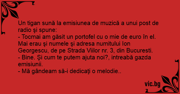Un tigan sună la emisiunea de muzică a unui post de radio şi spune: