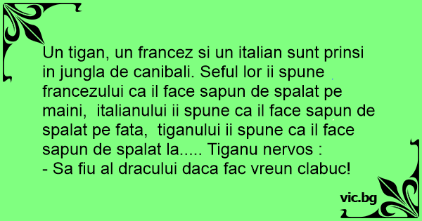 Un tigan, un francez si un italian sunt prinsi in jungla de canibali. Seful lor ii spune francezului ca il face sapun de spalat pe maini, italianului ii spune ca il face sapun de spalat pe fata, tiganului ii spune ca il face sapun de spalat la..... Tiganu nervos :