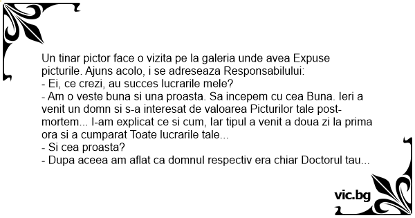 - Am o veste buna si una proasta. Sa incepem cu cea Buna. Ieri a venit un domn si s-a interesat de valoarea Picturilor tale post-mortem... I-am explicat ce si сuм, Iar tipul a venit a doua zi la prima ora si a cumparat Toate lucrarile tale...