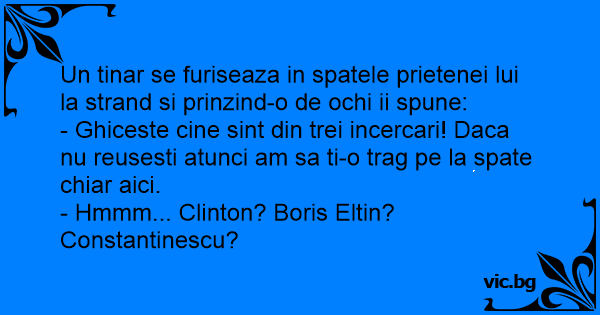 - Ghiceste cine sint din trei incercari! Daca nu reusesti atunci am sa ti-o trag pe la spate chiar aici.