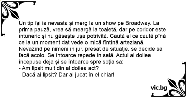 Un tip îşi ia nevasta şi merg la un show pe Broadway. La prima pauză, vrea să meargă la toaletă, dar pe coridor este întuneric şi nu găseşte uşa potrivită. Caută el ce caută pînă ce la un moment dat vede o mică fîntînă arteziană. Nevăzînd pe nimeni în jur, presat de situaţie, se decide să facă acolo. Se întoarce repede în sală. Actul al doilea începuse deja şi se întoarce spre soţia sa:
