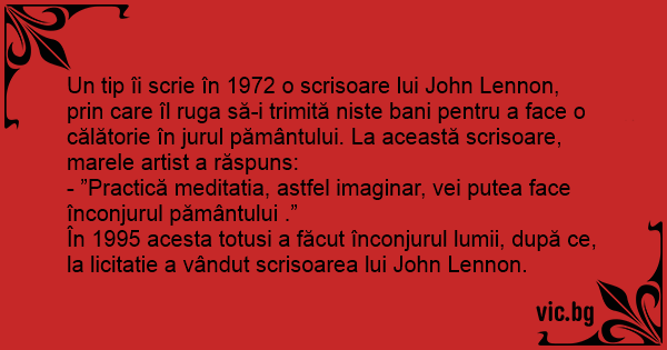 Un tip îi scrie în 1972 o scrisoare lui John Lennon, prin care îl ruga să-i trimită niste bani pentru a face o călătorie în jurul pământului. La această scrisoare, marele artist a răspuns: