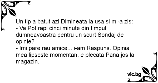 - Imi pare rau amice... i-am Raspuns. Opinia mea lipseste momentan, e plecata Pana jos la magazin.