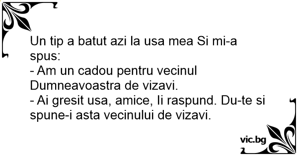 - Ai gresit usa, amice, Ii raspund. Du-te si spune-i asta vecinului de vizavi.
