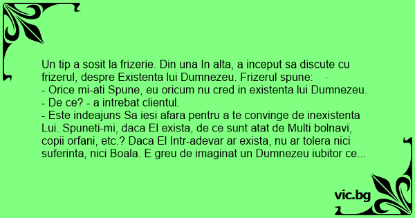 Un tip a sosit la frizerie. Din una In alta, a inceput sa discute cu frizerul, despre Existenta lui Dumnezeu. Frizerul spune: