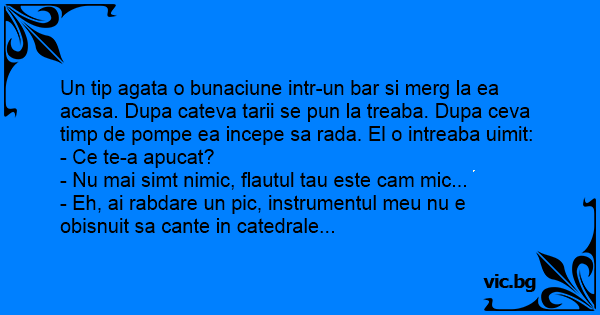 Un tip agata o bunaciune intr-un bar si merg la ea acasa. Dupa cateva tarii se pun la treaba. Dupa ceva timp de pompe ea incepe sa rada. El o intreaba uimit: