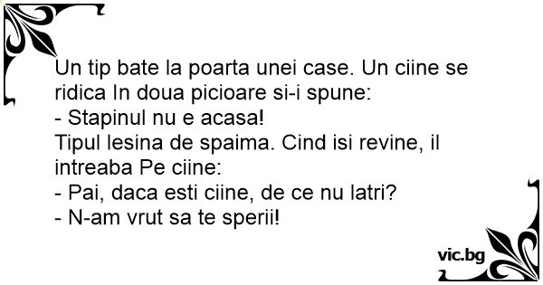 Un tip bate la poarta unei case. Un ciine se ridica In doua picioare si-i spune: