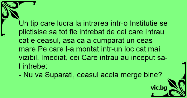 Un tip care lucra la intrarea intr-o Institutie se plictisise sa tot fie intrebat de cei care Intrau cat e ceasul, asa ca a cumparat un ceas mare Pe care l-a montat intr-un loc cat mai vizibil. Imediat, cei Care intrau au inceput sa-l intrebe: