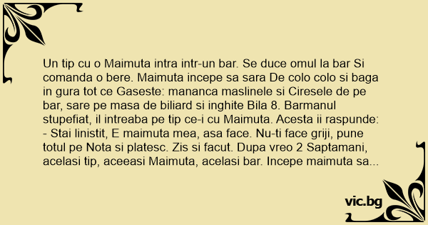- Stai linistit, E maimuta mea, asa face. Nu-ti face griji, pune totul pe Nota si platesc. Zis si facut. Dupa vreo 2 Saptamani, acelasi tip, aceeasi Maimuta, acelasi bar. Incepe maimuta sa Sara ca nebuna. Sare pe bar, ia o maslina, o baga In fund, o scoate si apoi o inghite. La fel si cu o Cireata. Barmanul, mirat, se adreseaza tipului: