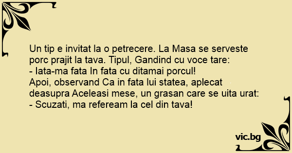 Un tip e invitat la o petrecere. La Masa se serveste porc prajit la tava. Tipul, Gandind cu voce tare: