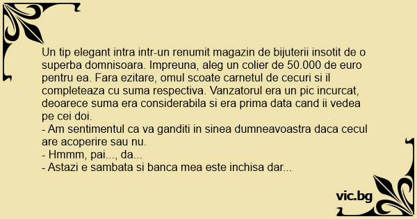 Un tip elegant intra intr-un renumit magazin de bijuterii insotit de o superba domnisoara. Impreuna, aleg un colier de 50.000 de euro pentru ea. Fara ezitare, omul scoate carnetul de cecuri si il completeaza cu suma respectiva. Vanzatorul era un pic incurcat, deoarece suma era considerabila si era prima data cand ii vedea pe cei doi.
