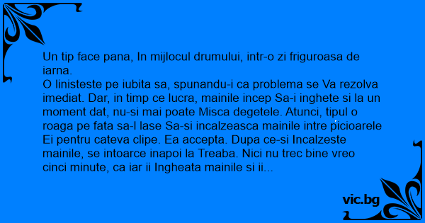 O linisteste pe iubita sa, spunandu-i ca problema se Va rezolva imediat. Dar, in timp ce lucra, mainile incep Sa-i inghete si la un moment dat, nu-si mai poate Misca degetele. Atunci, tipul o roaga pe fata sa-l lase Sa-si incalzeasca mainile intre picioarele Ei pentru cateva clipe. Ea accepta. Dupa ce-si Incalzeste mainile, se intoarce inapoi la Treaba. Nici nu trec bine vreo cinci minute, ca iar ii Ingheata mainile si ii cere fetei sa i le Incalzeasca si tot asa, din cinci in cinci Minute, pana cand fata plictisita il intreaba: