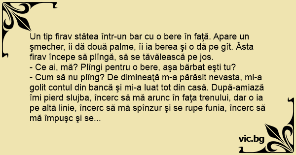 Un tip firav stătea într-un bar cu o bere în faţă. Apare un şmecher, îi dă două palme, îi ia berea şi o dă pe gît. Ăsta firav începe să plîngă, să se tăvălească pe jos.