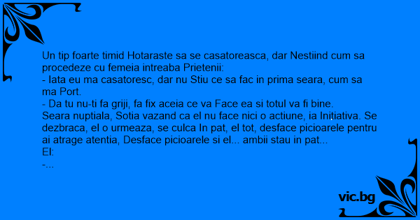 Un tip foarte timid Hotaraste sa se casatoreasca, dar Nestiind сuм sa procedeze cu femeia intreaba Prietenii: