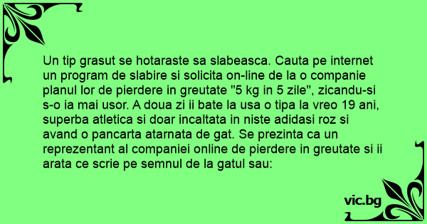 Un tip grasut se hotaraste sa slabeasca. Cauta pe internet un program de slabire si solicita on-line de la o companie planul lor de pierdere in greutate "5 kg in 5 zile", zicandu-si s-o ia mai usor. A doua zi ii bate la usa o tipa la vreo 19 ani, superba atletica si doar incaltata in niste adidasi roz si avand o pancarta atarnata de gat. Se prezinta ca un reprezentant al companiei online de pierdere in greutate si ii arata ce scrie pe semnul de la gatul sau: