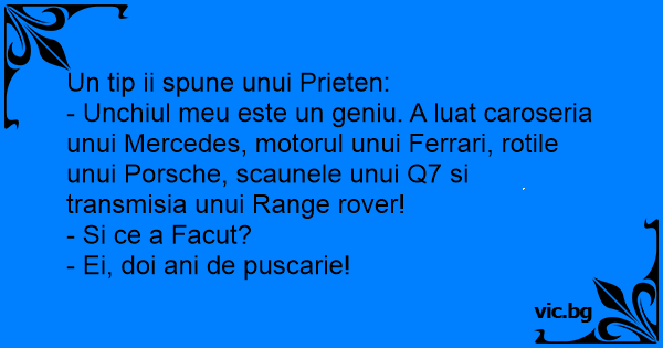 - Unchiul meu este un geniu. A luat caroseria unui Mercedes, motorul unui Ferrari, rotile unui Porsche, scaunele unui Q7 si transmisia unui Range rover!