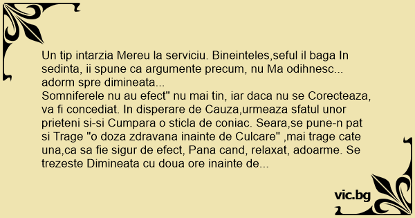Somniferele nu au efect" nu mai tin, iar daca nu se Corecteaza, va fi concediat. In disperare de Cauza,urmeaza sfatul unor prieteni si-si Cumpara o sticla de coniac. Seara,se pune-n pat si Trage "o doza zdravana inainte de Culcare" ,mai trage cate una,ca sa fie sigur de efect, Pana cand, relaxat, adoarme. Se trezeste Dimineata cu doua ore inainte de a suna ceasul, perfect Odihnit, c-o foame sanatoasa,сuм nu mai vazuse Demult, si ajunge la serviciu printre primii. Apare si Seful.