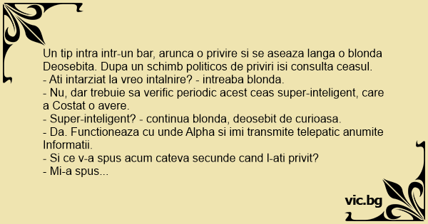 Un tip intra intr-un bar, arunca o privire si se aseaza langa o blonda Deosebita. Dupa un schimb politicos de priviri isi consulta ceasul.