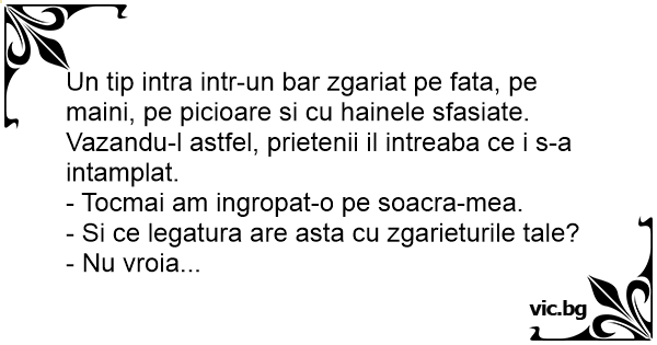Un tip intra intr-un bar zgariat pe fata, pe maini, pe picioare si cu hainele sfasiate. Vazandu-l astfel, prietenii il intreaba ce i s-a intamplat.