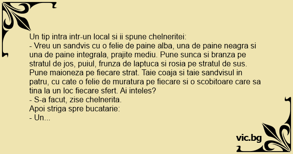 Un tip intra intr-un local si ii spune chelneritei: