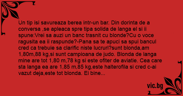 Un tip isi savureaza berea intr-un bar. Din dorinta de a conversa ,se apleaca spre tipa solida de langa el si ii spune:Vrei sa auzi un banc trasnit cu blonde?Cu o voce ragusita ea ii raspunde?-Pana sa te apuci sa spui bancul cred ca trebuie sa clarific niste lucruri?sunt blonda,am 1,80m,88 kg,si sunt campioana de judo. Blonda de langa mine are tot 1,80 m,78 kg si este ofiter de aviatie. Cea care sta langa ea are 1,85 m,85 kg,este halterofila si cred c-ai vazut deja,este tot blonda. Ei bine acum mai vrei sa ne spui bancul acela cu blonde?Omul sta ceva timp si se gandeste.-Nu prea,spune el. N-am chef sa explic poanta de trei ori.