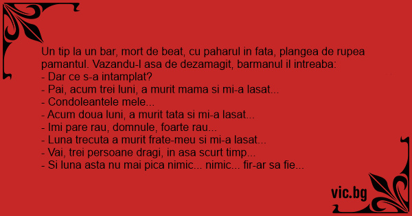 Un tip la un bar, mort de beat, cu paharul in fata, plangea de rupea pamantul. Vazandu-l asa de dezamagit, barmanul il intreaba: