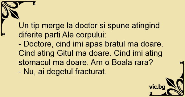 - Doctore, cind imi apas bratul ma doare. Cind ating Gitul ma doare. Cind imi ating stomacul ma doare. Am o Boala rara?