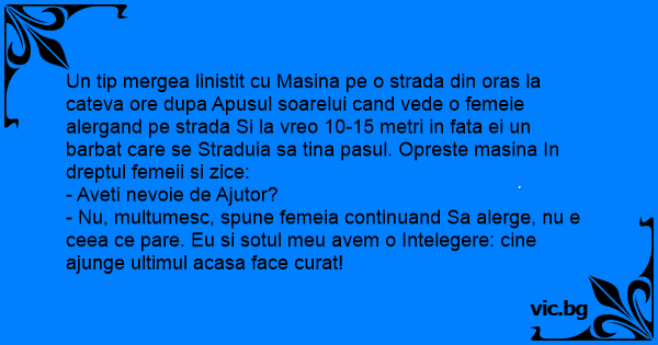 Un tip mergea linistit cu Masina pe o strada din oras la cateva ore dupa Apusul soarelui cand vede o femeie alergand pe strada Si la vreo 10-15 metri in fata ei un barbat care se Straduia sa tina pasul. Opreste masina In dreptul femeii si zice: