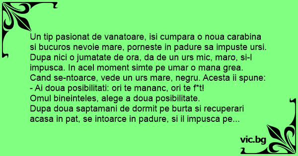 Un tip pasionat de vanatoare, isi cumpara o noua carabina si bucuros nevoie mare, porneste in padure sa impuste ursi.