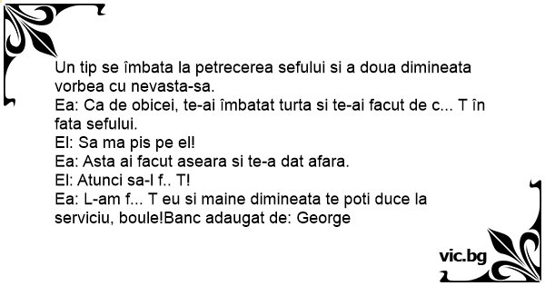Ea: L-am f... T eu si maine dimineata te poti duce la serviciu, boule!Banc adaugat de: George