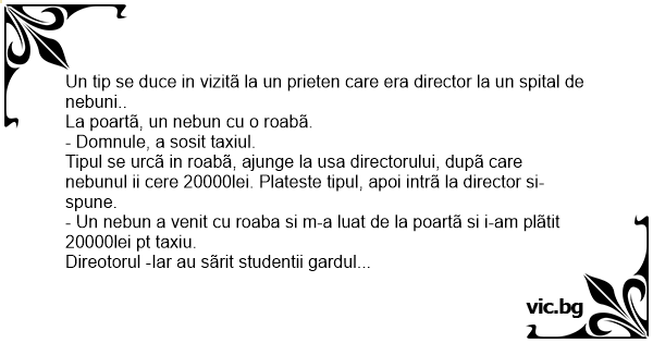 Tipul se urcã in roabã, ajunge la usa directorului, dupã care nebunul ii cere 20000lei. Plateste tipul, apoi intrã la director si-spune.