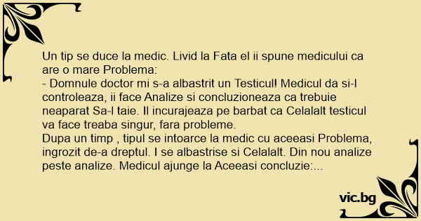 - Domnule doctor mi s-a albastrit un Testicul! Medicul da si-l controleaza, ii face Analize si concluzioneaza ca trebuie neaparat Sa-l taie. Il incurajeaza pe barbat ca Celalalt testicul va face treaba singur, fara probleme.