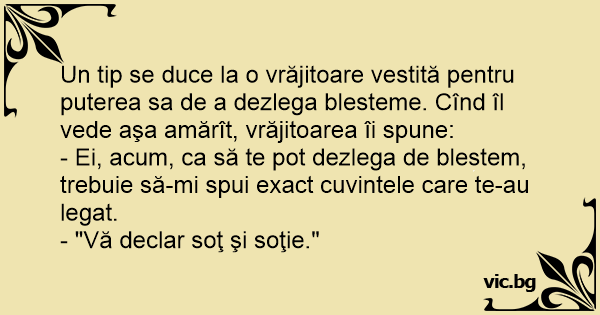 Un tip se duce la o vrăjitoare vestită pentru puterea sa de a dezlega blesteme. Cînd îl vede aşa amărît, vrăjitoarea îi spune: