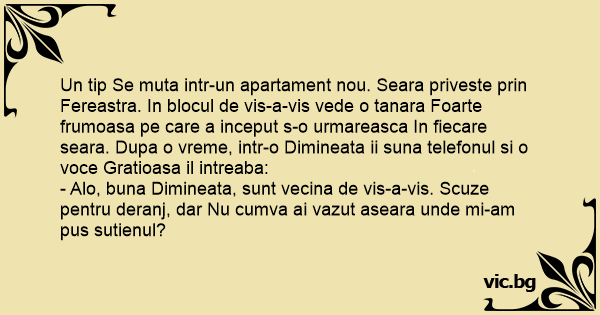 - Alo, buna Dimineata, sunt vecina de vis-a-vis. Scuze pentru deranj, dar Nu cumva ai vazut aseara unde mi-am pus sutienul?